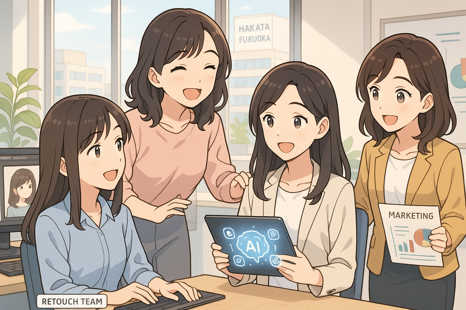 E-girls博多は、レタッチ専属部署・AI部署・マーケティング部署といった専門チームで、現場に立つ女性の皆さんをトータルサポート。安心して働きながら、自分らしく輝ける場所です。